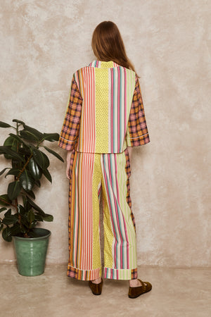 This lively design brings together colourful stripes, hand drawn florals, and tartan details in a playful patchwork of clashing patterns that somehow get along rather brilliantly. Inspired by nostalgic textiles and the cheerful charm of a good old fashioned stick of rock, it is a print full of personality, colour, and a little bit of delightful chaos.