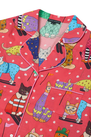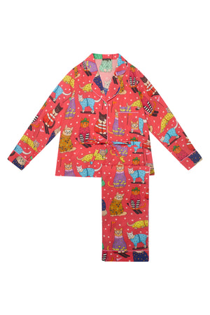 Hit the slopes in style or at least dream about it in our Skiing Cats Cotton Pyjama Set. Against a vibrant coral red backdrop, fashionable felines glide through snowy peaks in their chicest winter looks, from patterned ski suits to oversized goggles.