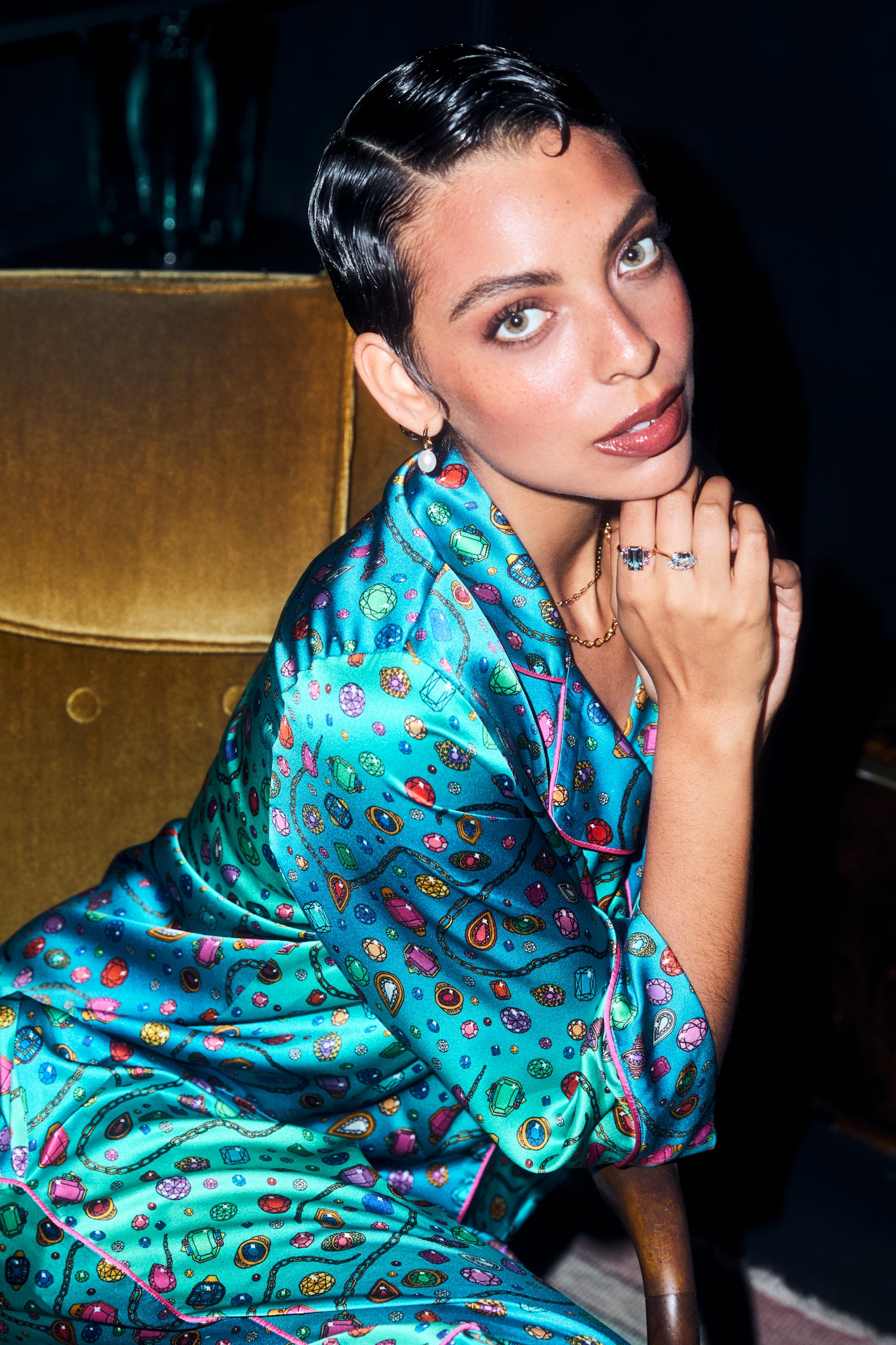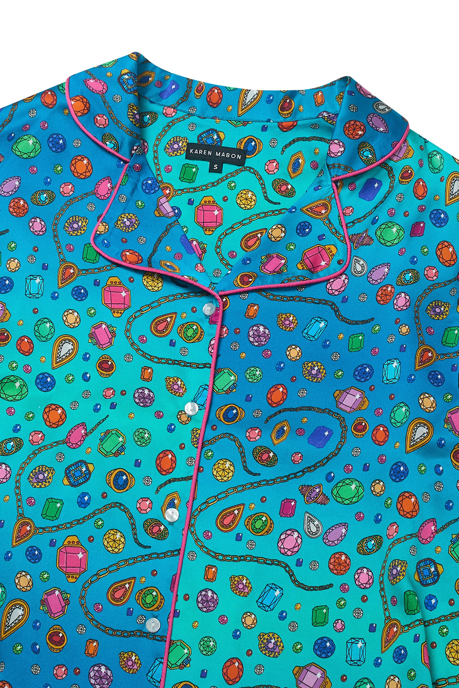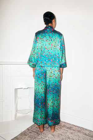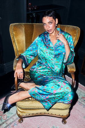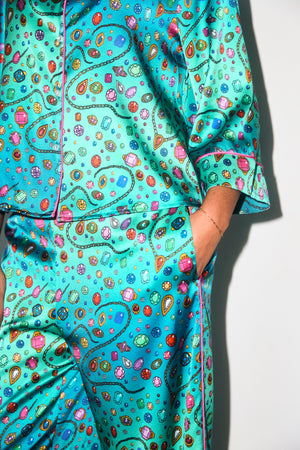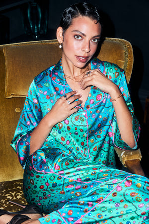 Our limited-edition ‘Bejewelled’ Silk Pyjama Set features a cascade of gemstones and golden chains, inspired by Dinny Hall’s iconic jewellery sketches and reimagined in Karen’s hand-drawn style. The print shimmers across lustrous silk in a rich teal-to-green ombré, creating loungewear that feels as precious as treasure.