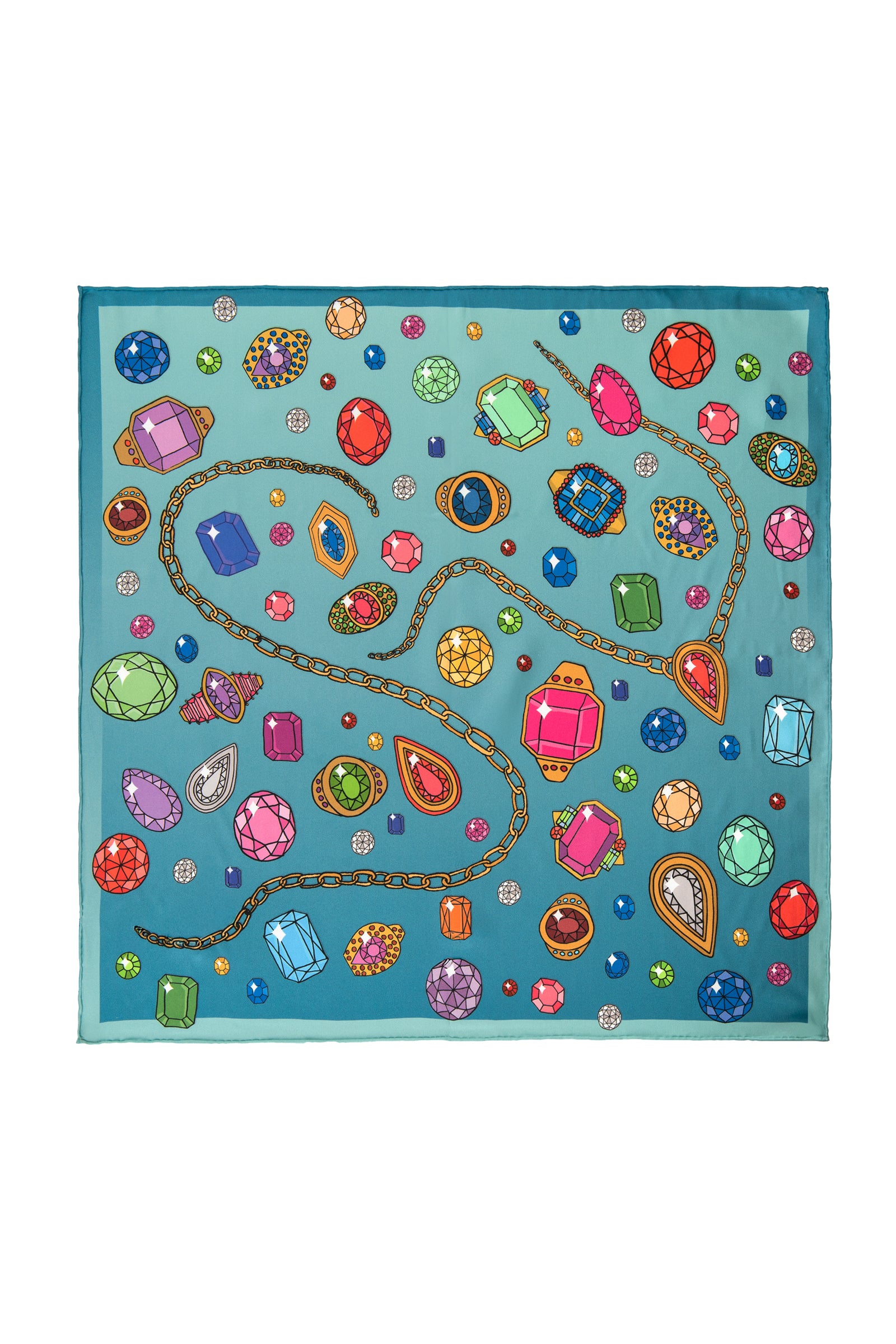The Bejewelled Silk Scarf in Blue is a dreamy, jewel inspired expression of our collaboration with Dinny Hall. Karen’s hand drawn gemstones and sweeping gold chains shimmer across a cool blue silk base, evoking the feeling of hidden treasures and moonlit sparkle.