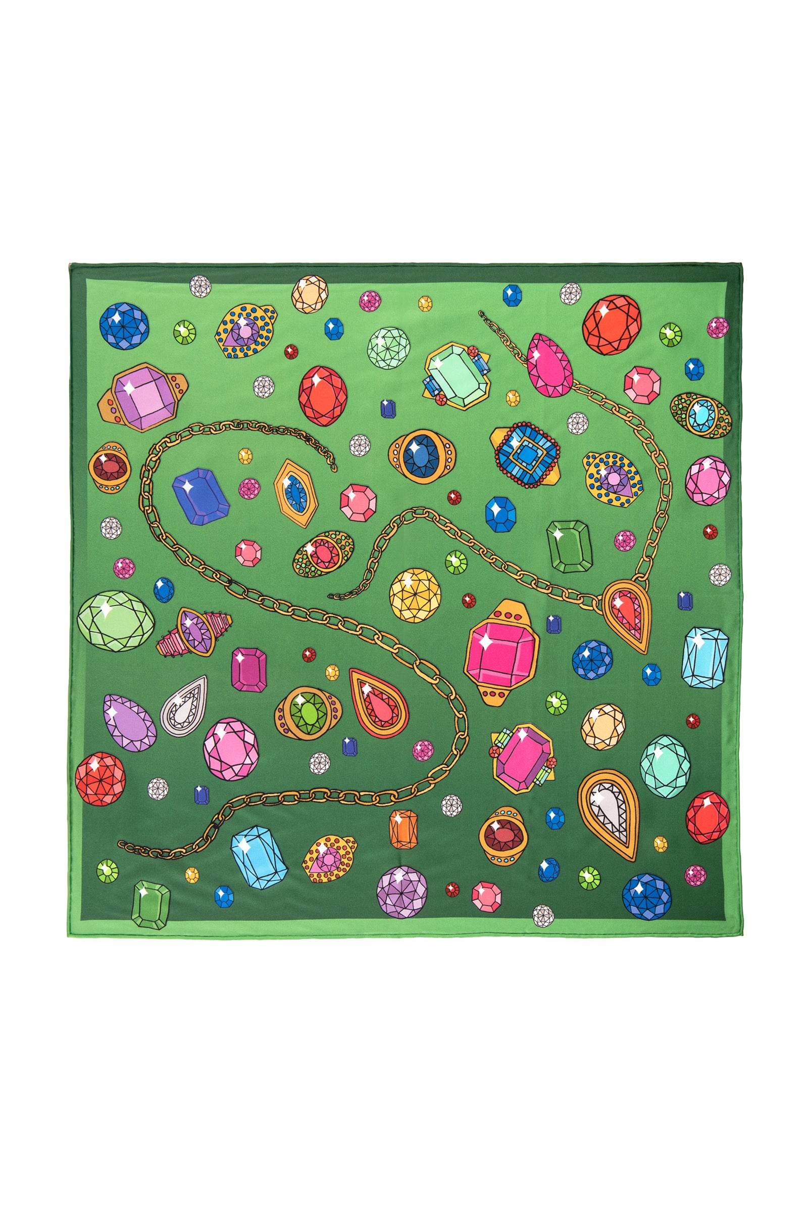 The Bejewelled Silk Scarf in Green captures the lush, jewel toned heart of our collaboration with Dinny Hall. Hand drawn gemstones and flowing gold chains intertwine across a deep green silk canvas, creating a print that feels elegant, playful and full of story.