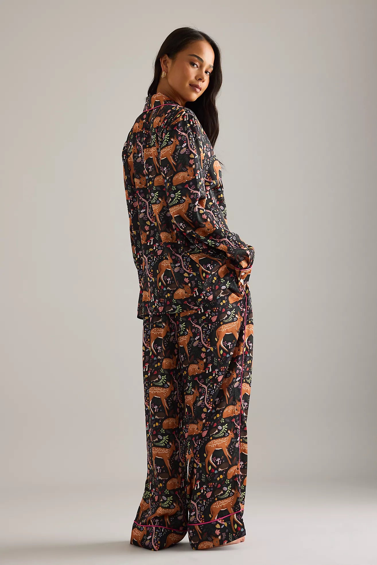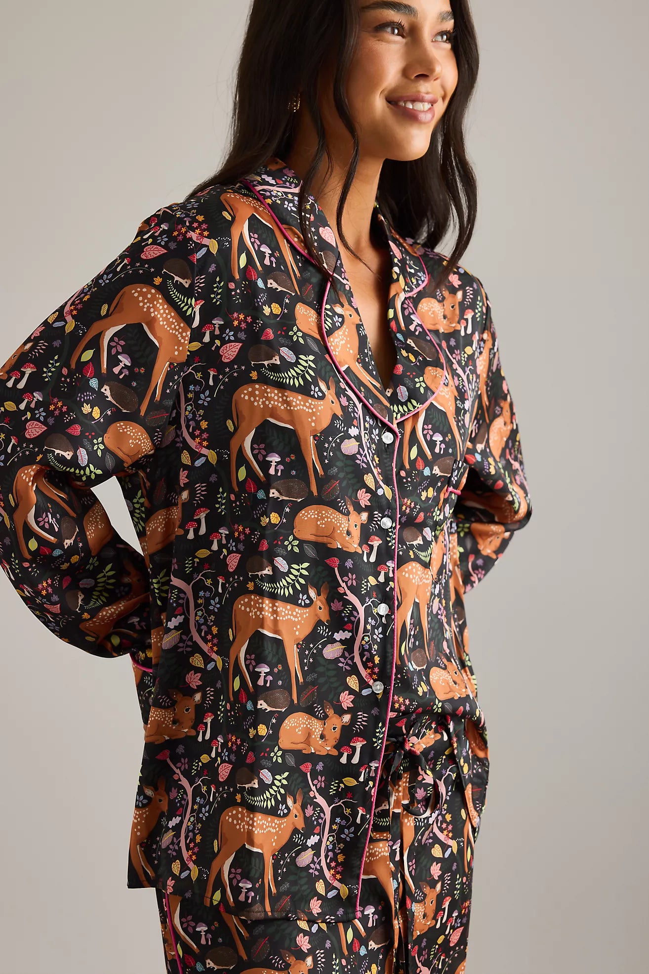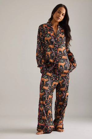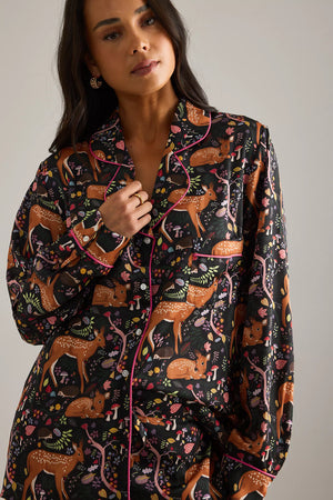 Step into a moonlit woodland with our Flora and Fauna Classic Long Pyjama Set. Set against a deep black backdrop, Karen’s hand drawn forest creatures come to life as delicate deer wander through leafy branches and tiny toadstools peek out from beneath winding plants.
